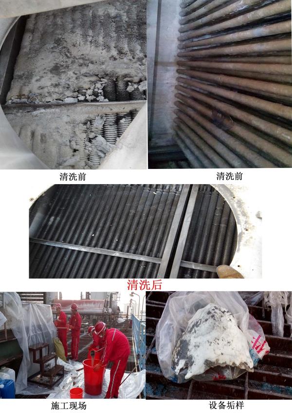 復(fù)合型蒸發(fā)式冷卻器上部是風(fēng)冷式,下部為水冷式。因此上部翅片管束表面由于接觸環(huán)境大氣、易于積存油膩、塵垢、煙垢、柳絮等附著物,形成較大的熱阻,污垢的存在將大大降低甚至喪失鋁翅片冷換設(shè)備的冷卻作用。另外鋁翅片表面的污垢也會促使垢下腐蝕。下部水冷式光管表面由于外部環(huán)境條件影響,并且由蒸發(fā)式空冷器的特點,造成循環(huán)冷卻水濃縮快,濃縮倍率高,硬度,堿度高,濁度高等困難。在長期運行過程中,空冷器光管束表面生成了很厚的硬垢,嚴(yán)重影響了空冷器換熱效果,增加了能耗,影響了正常生產(chǎn)和安全。為了保證設(shè)備安全,穩(wěn)定運行,延長使用壽命,提高冷卻效率,應(yīng)對其進行定期清洗。