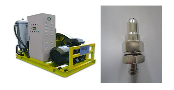 高壓射流清洗:是使用高壓泵打出高壓水,并經(jīng)過一定管路到達(dá)噴嘴,再把高壓力低流速的水轉(zhuǎn)換為高壓力高流速的射流,然后射流以其很高的沖擊動(dòng)能,連續(xù)不斷地作用在被清洗表面,從而使垢物脫落,最終實(shí)現(xiàn)清洗目的。